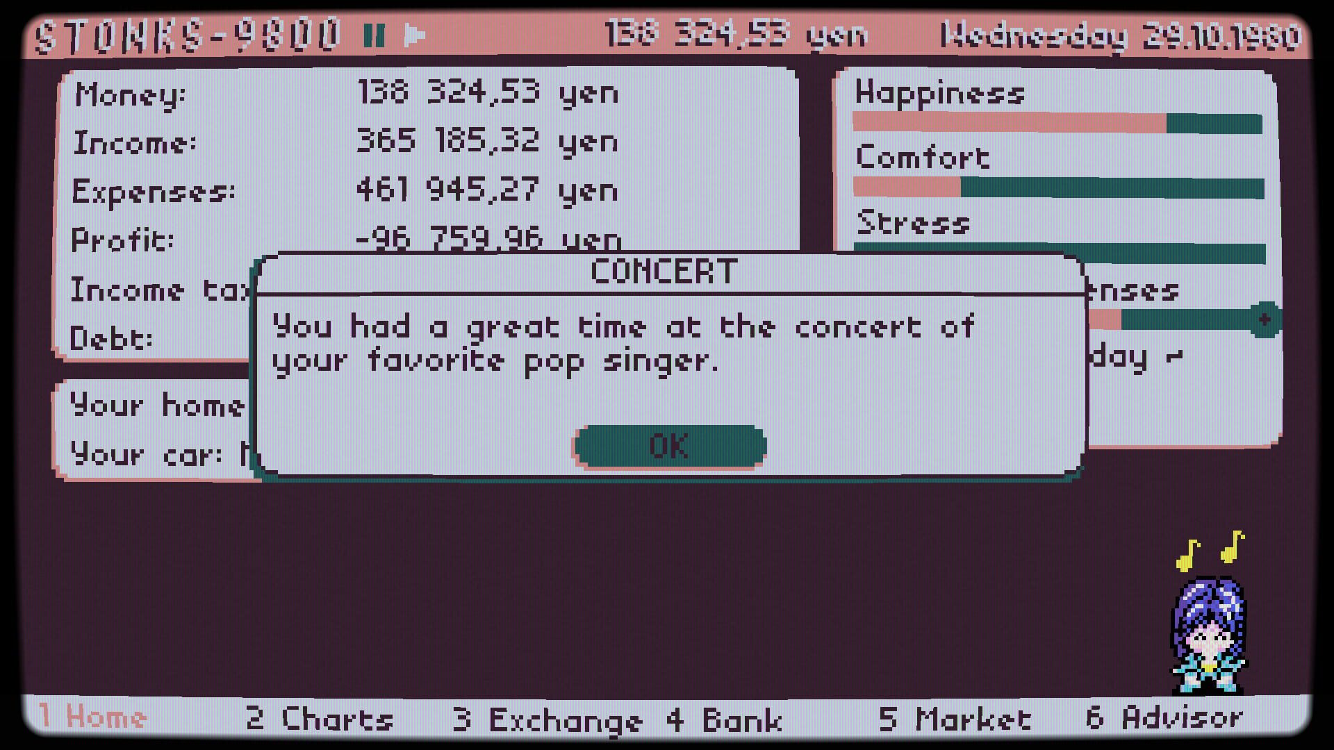 Simulator of an 80s Japanese stock market businessman. Chill, catch a retro vibe and watch your profits grow in the text-based game STONKS-9800.